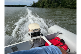 A lot bigger than the other 'standard' inflatable that I have, and also faster. Seems very well built. A standard-shaft OB motor will not work with this raft. It will cavitate, no matter how far you trim down. I'm using a 1980 Johnson 9.9. So I will either have to find a long-shaft OB motor, or may possibly notch the transom a few inches (Discussing with the manufacturer).
