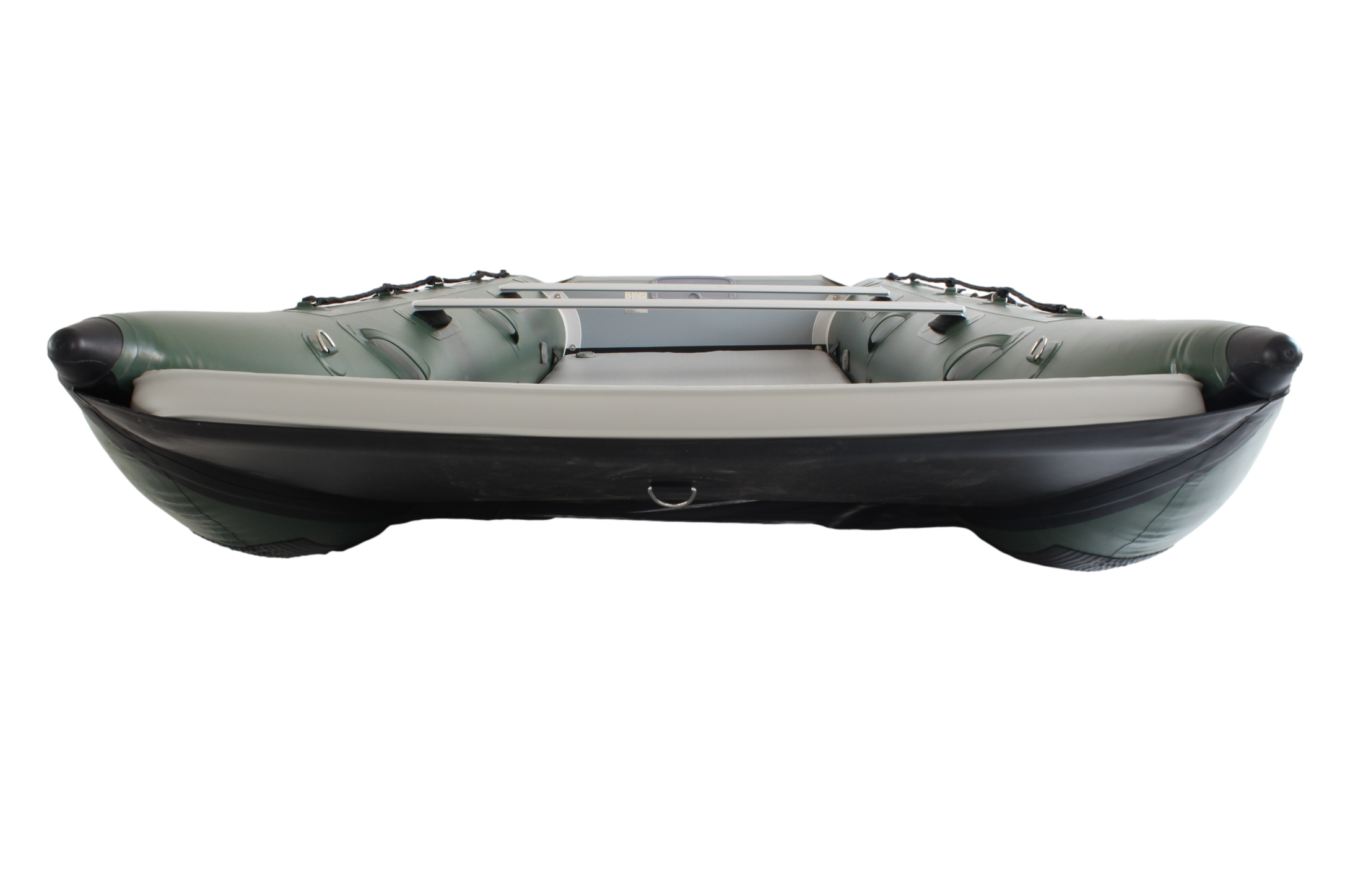 The large diameter tubes provide improved performance and stability and the lowered front bow allows swimmers to quickly get in and out of the water when swimming. The splash plate on the back of the transom minimizes outdoor motor splash and the fins on the bottom help with tracking and directional stability.